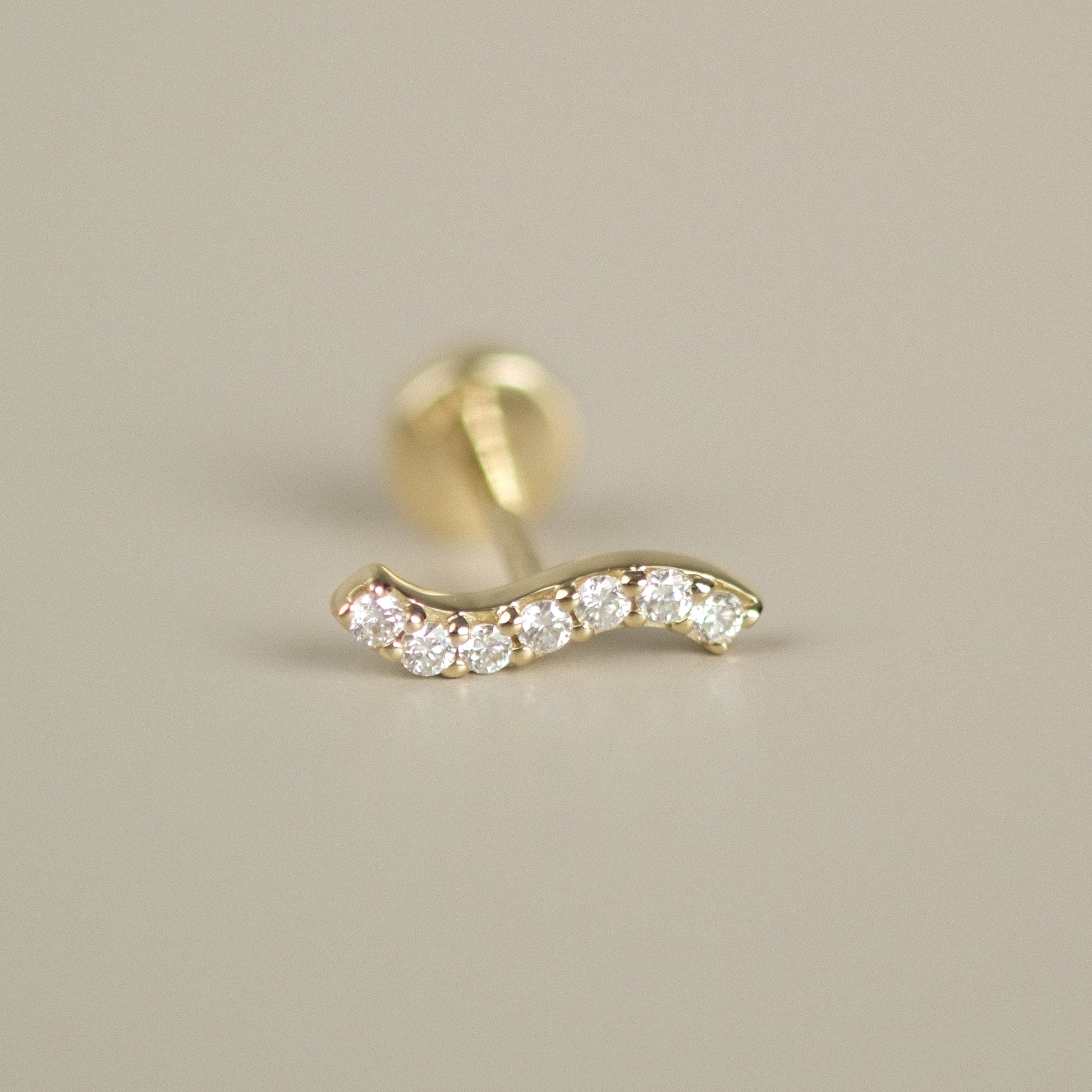 Funkelndes Statement. Unser Diamond Wave Stud aus 585er Massivgold besticht durch seine sanft wellenartige Form und ist mit 7 strahlenden Diamanten besetzt. Das moderne, dynamische Design macht diesen Stecker zu einem besonderen Blickfang, dessen Wirkung sich je nach Ausrichtung am Ohr mühelos verändern lässt.